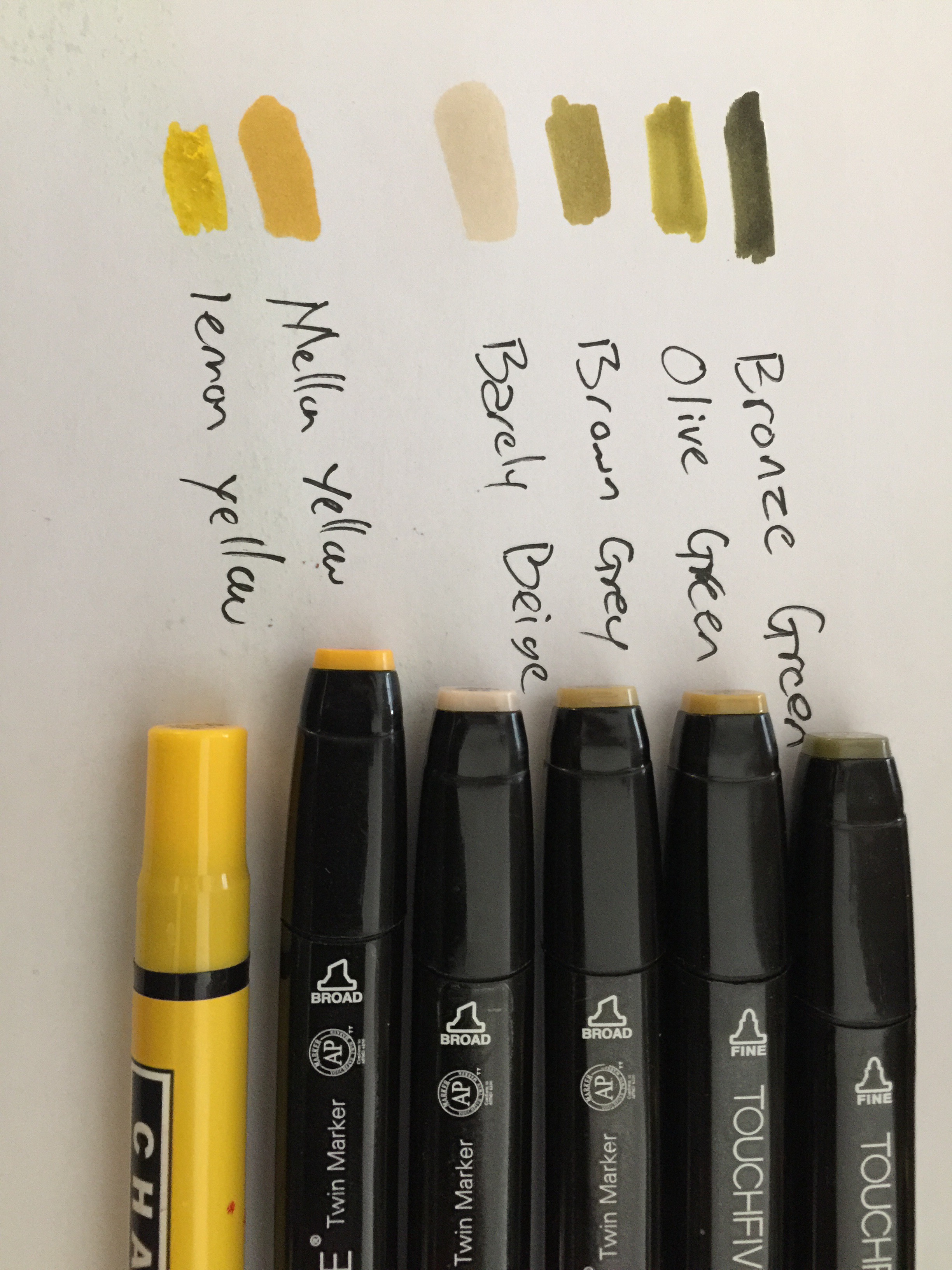 Once I am satisfied with inking the black in, I move to the markers starting with darker shades and then working to the light shade. On this piece I used a combination of Chafford, Touch Five, and Copic Markers.